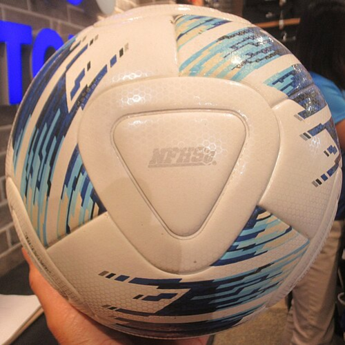 Ballon de football taille 5, qualité match. Résistant aux terrains en terre battue typiques du Congo. Cousu main, longue durée de vie.